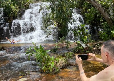 Para conhecer as cachoeiras, o passeio inclui uma caminhada leve de cerca de 4 km (ida e volta), feita com calma e paradas para banho ao longo do percurso com a possibilidade de aproveitar trechos menores, dependendo do ritmo do grupo.