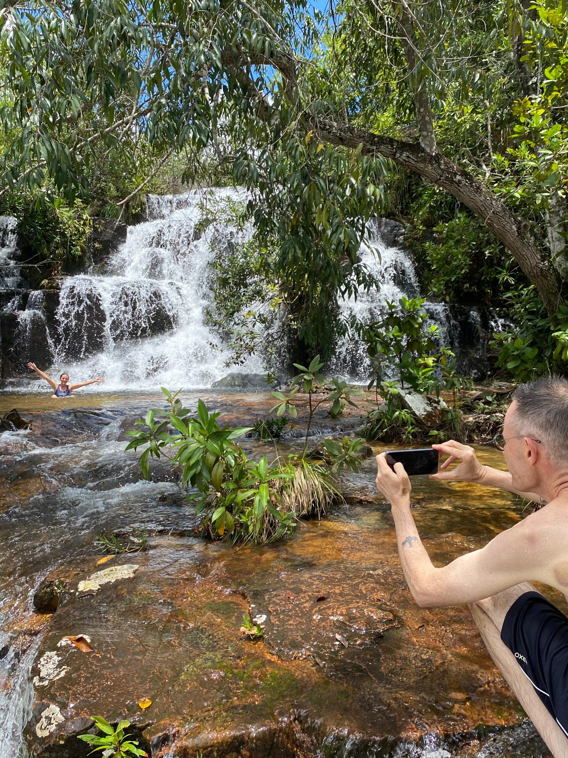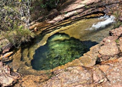The day usually begins at Pocinho do Amor, a small natural pool with running water and greenish tones, surrounded by buriti palms a typical Cerrado plant.