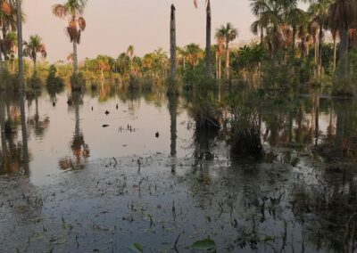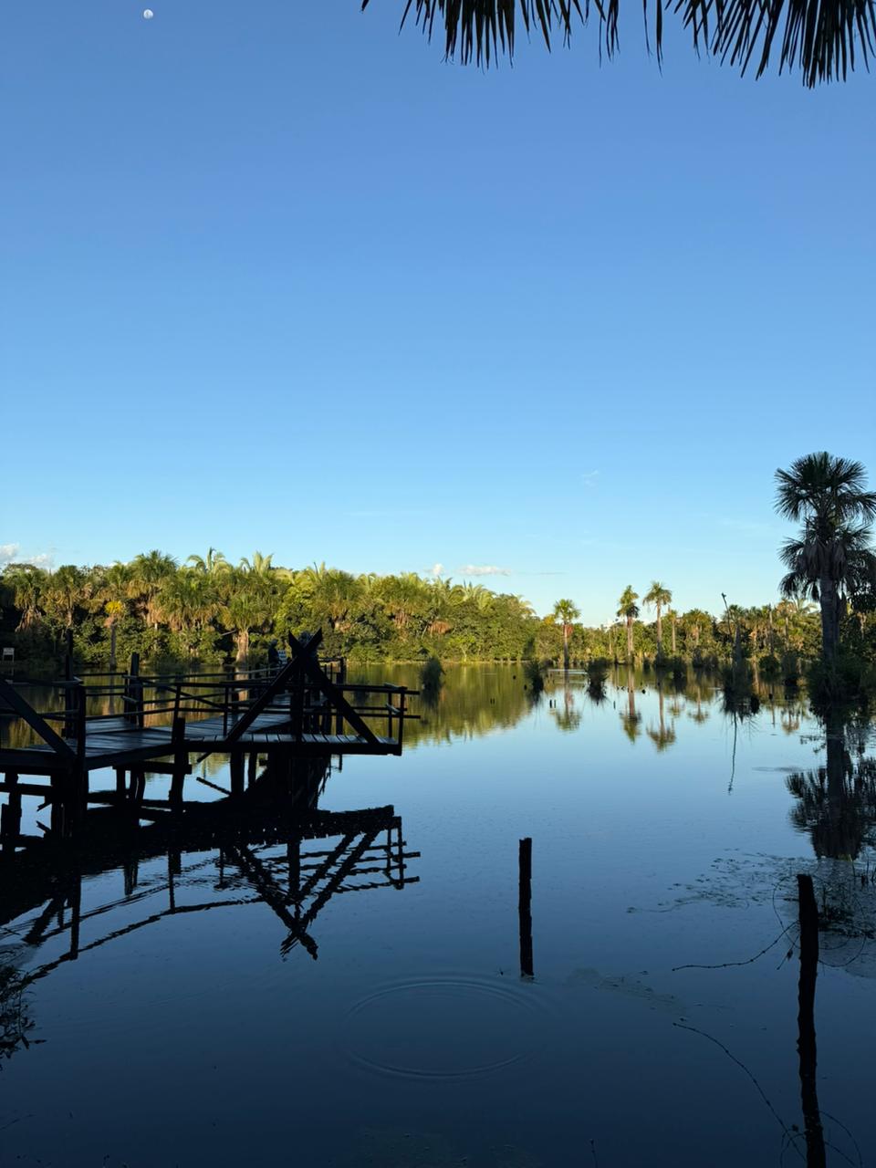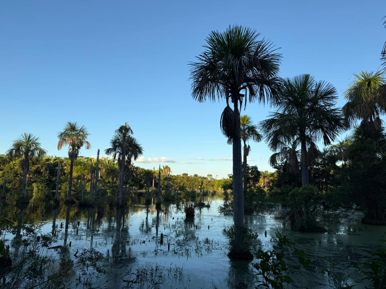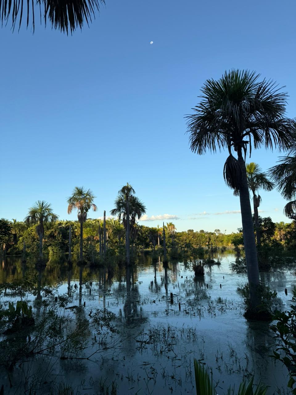 Cercada por buritis e vegetação típica do Cerrado, a lagoa é conhecida por abrigar dezenas de espécies de aves que retornam todos os dias ao entardecer para descansar entre as palmeiras.
